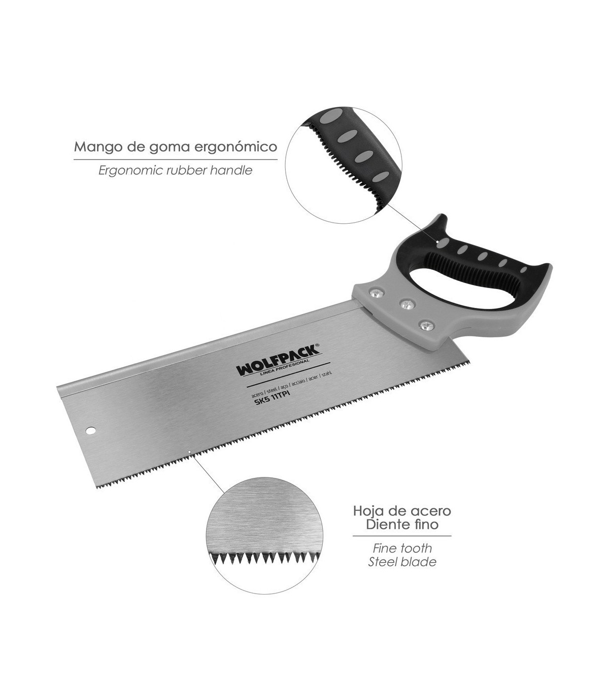 - Dientes del serrucho templados con triple afilado, cuenta con una separación de 11 TPI, especialmente diseñado para maderas blandas, contrachapados, suelos, laminados, tuberías de plástico PVC/ABS, etc..